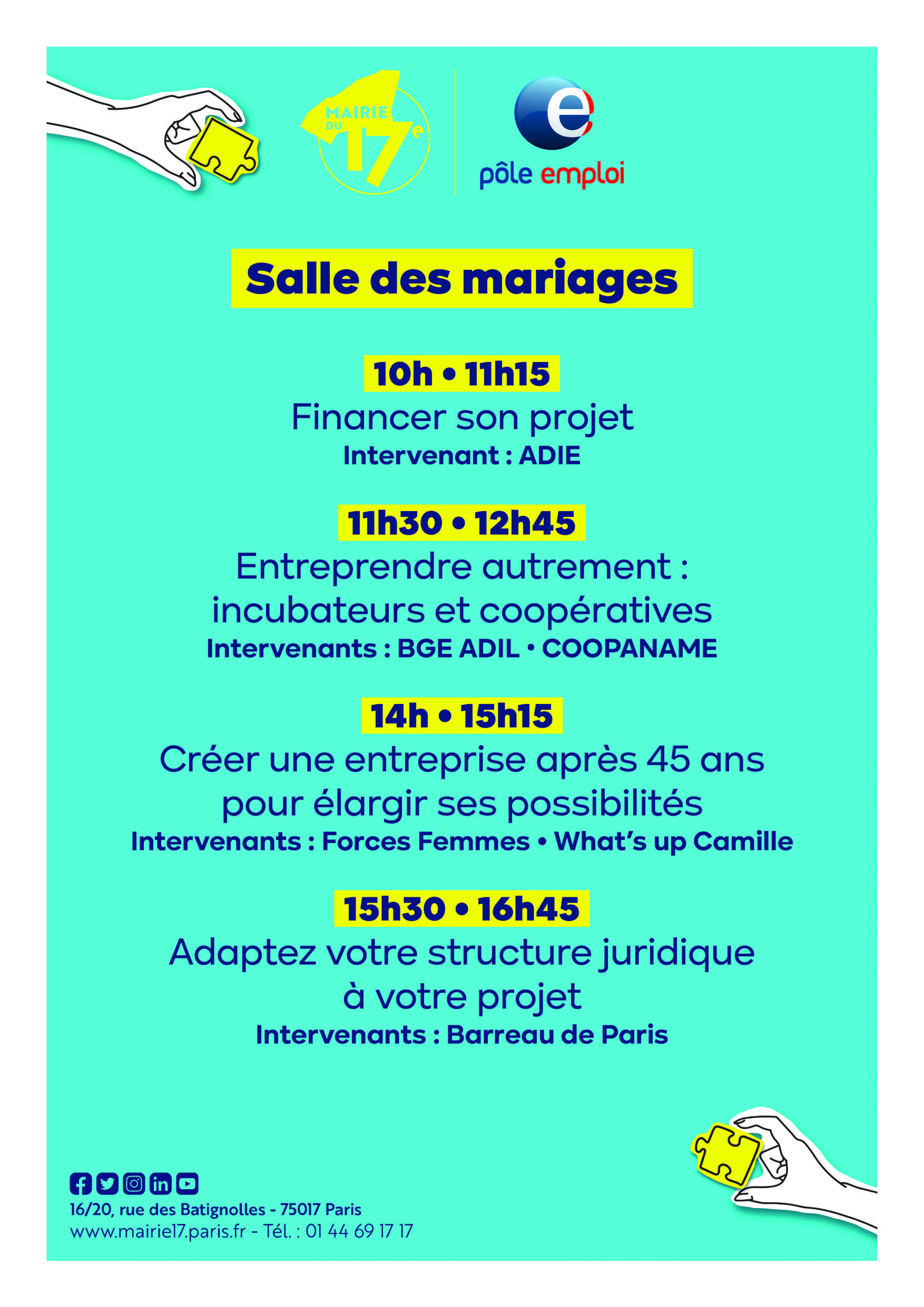 Le Forum de Création d’Entreprises se tiendra à la Mairie du 17e arrondissement le lundi 25 septembre de 10h à 17h. Co-organisé avec l’agence Pôle-emploi Cardinet, cet événement rassemblera des experts du domaine et offrira de nombreuses ressources pour faciliter la concrétisation de vos projets entrepreneuriaux.